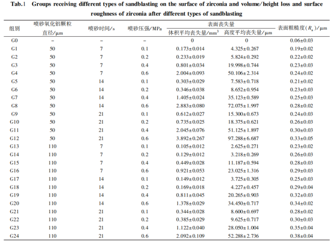 當(dāng)噴砂顆粒尺寸及噴砂壓強(qiáng)恒定時(shí),隨著噴砂時(shí)間的增加,氧化鋯粗糙度均顯著增加。當(dāng)噴 砂時(shí)間及噴砂顆粒大小恒定時(shí),隨著噴砂壓強(qiáng)增大,氧化鋯表面粗糙度也均隨之增加。對(duì)于噴砂顆粒大小而言,當(dāng)噴砂時(shí)間及噴砂壓強(qiáng)保持恒定,50μm噴砂顆粒噴砂后的氧化鋯表面 損失量顯著高于110μm噴砂顆粒噴砂后的氧化鋯表面損失量。噴砂可以導(dǎo)致氧化鋯表面損失;噴砂壓強(qiáng)越大、噴砂時(shí)間越長(zhǎng),氧化鋯表面損失量越多,其表面粗糙度越大。但也有研究表明,噴砂技術(shù)存在一定的隱患,大顆粒的噴砂可能導(dǎo)致氧化鋯修復(fù)體較為薄弱的部分發(fā)生碎裂以損壞。