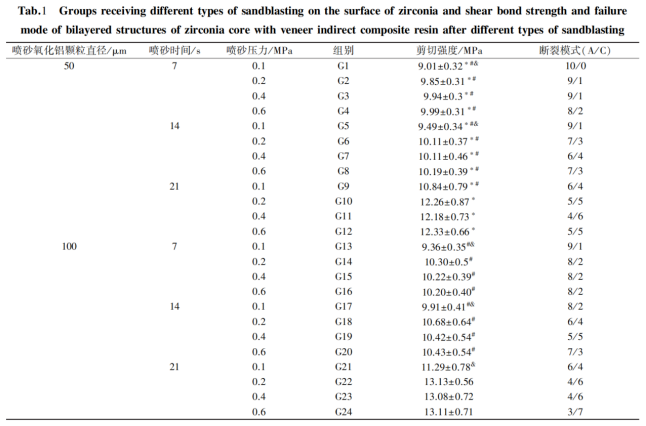 噴砂壓力為0.2、0.4及 0.6MPa時(shí)氧化鋯與間接修復(fù)樹(shù)脂界面的粘結(jié)強(qiáng)度顯著高于噴砂壓力為 0.1MPa時(shí)界面的粘結(jié)強(qiáng)度。但是粘結(jié)強(qiáng)度在噴砂壓力為 0.2、0.4及 0.6MPa時(shí)并沒(méi)有顯著變化。 同是,有相關(guān)文獻(xiàn)證實(shí)隨著噴砂壓力的增加,氧化鋯表面出現(xiàn)微裂紋或者缺陷的可能性隨著增加,從而降低氧化鋯強(qiáng)度,導(dǎo)致失敗,也有研究顯示經(jīng)車(chē)針研磨30秒后單斜晶體含量增加3%-5%,經(jīng)4bar噴砂15秒后單斜晶體含量增加13%-15%,這種轉(zhuǎn)化可以導(dǎo)致氧化鋯的劣化,所以并不是噴砂顆粒越大,時(shí)間越久,壓強(qiáng)越大,表面粗糙度越大就越好。
