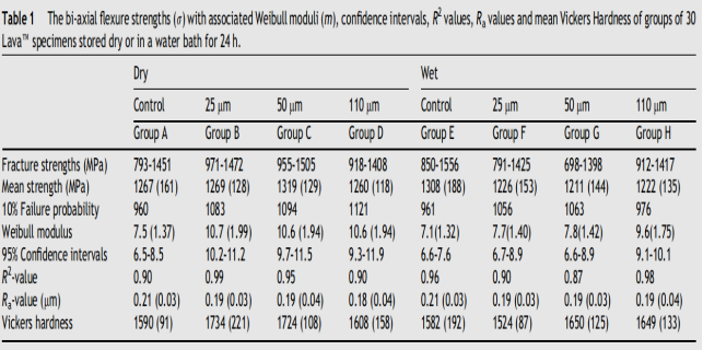 從國(guó)外這位學(xué)者得出的的數(shù)據(jù)可知,在不同顆粒大小的氧化鋯噴砂下的斷裂強(qiáng)度,不論是干燥儲(chǔ)存還是是儲(chǔ)存相比對(duì)照組都是增大的,由此可知不論是從它的粘接強(qiáng)度還是陶瓷的機(jī)械強(qiáng)度來(lái)說(shuō)都是有利的。綜上所述,考慮到氧化鋯的的表面粗糙度,機(jī)械強(qiáng)度,以及粘接強(qiáng)度,采用0.2MPa及 50μm或者110μm的噴砂條件對(duì)使氧化鋯與間接修復(fù)樹(shù)脂界面的粘結(jié)強(qiáng)度較佳,是較為推薦的噴砂條件。